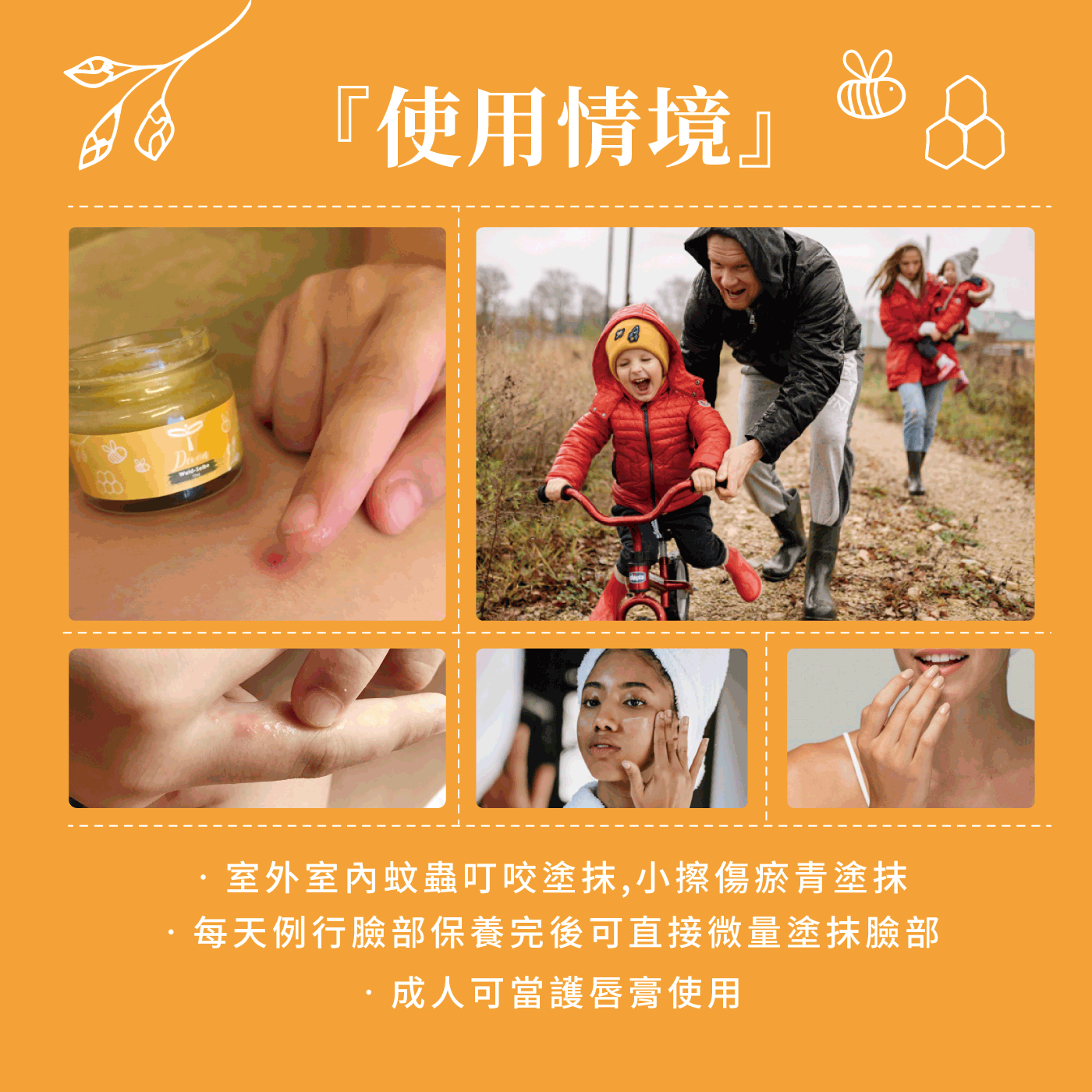2. 一般外用:成人可當護唇用、蚊蟲叮咬後使用、戶外活動使肌膚粗糙可使用。